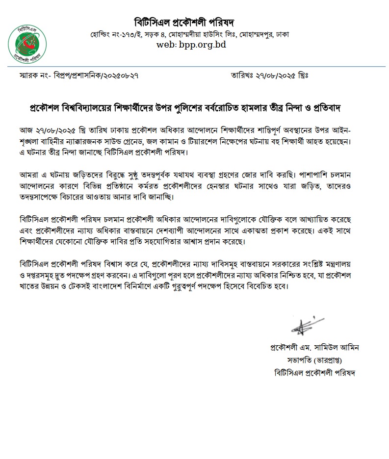 আজ ২৭/০৮/২০২৫ খ্রিঃ ঢাকায় প্রকৌশল অধিকার আন্দোলন শিক্ষার্থীদের শান্তিপূর্ণ অবস্থানের উপর আইন-শৃঙ্খলা বাহিনীর ন্যাক্কারজনক সন্ত্রাসী হামলার ঘটনায় শতাধিক শিক্ষার্থী আহত হয়েছে। এ ঘটনার তীব্র নিন্দা জানাচ্ছে বিটিসিএল প্রকৌশলী পরিষদ।আমরা এ ঘটনার সাথে জড়িতদের বিরুদ্ধে সুচিন্তিত তদন্তমূলক ব্যবস্থা গ্রহণের জোর দাবি করছি।  পাশাপাশি চলমান প্রকৌশলীদের ন্যায্য অধিকার আদায় আন্দোলনে হেনস্থার ঘটনায় সাথে যারা জড়িত, তাদেরকে দৃষ্টান্তমূলক বিচারের আওতায় আনার দাবি জানাচ্ছি।